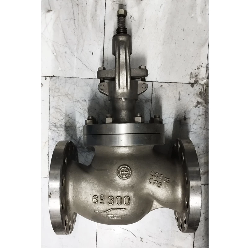 جنس بدنه مطابق حک CF8 بوده که نشاندهنده استنلس استیل 304 ریختهگری مطابق ASTM A351 است. این متریال مقاومت مناسبی در برابر خوردگی، رطوبت و دمای بالا دارد و برای سیالاتی مانند آب، بخار، روغن و برخی مواد شیمیایی کاربرد گستردهای دارد. طراحی درپوش از نوع Bolted Bonnet است که تعمیر و سرویس شیر را آسان میکند. علامت 300 روی بدنه بیانگر کلاس فشاری ANSI Class 300 است که این شیر را مناسب کار در فشارهای متوسط تا بالا میسازد. همچنین علامت 6B معمولاً به سایز اسمی 6 اینچ (DN150) اشاره دارد. اتصال فلنجی دو طرف شیر، نصب ایمن و استاندارد آن را در خطوط لوله صنعتی تضمین میکند.
