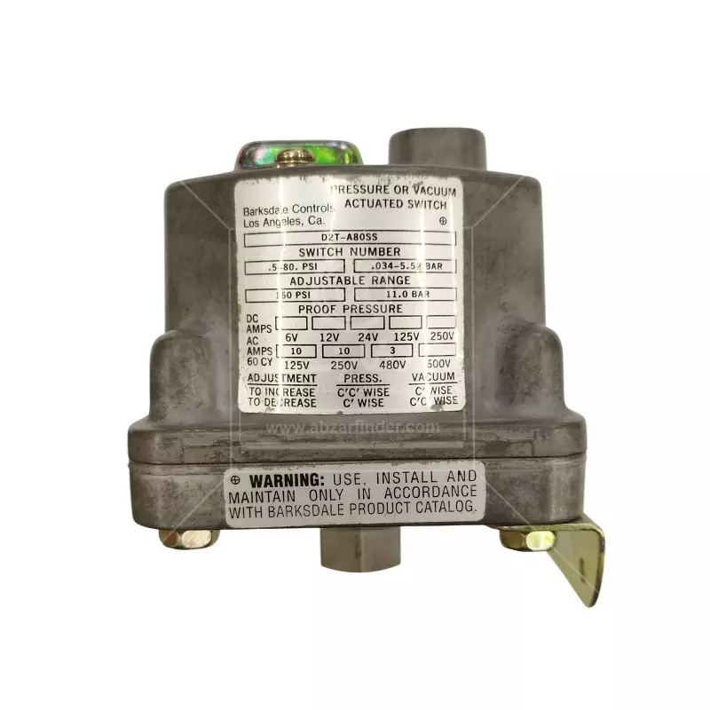 پرشر سوئیچ بارکسدیل مدل D2T-A80SS دارای دقت نسبتاً خوب برای کاربردهای عمومی کنترل فشار است، این محصول توسط شرکت Barksdale تولید شده است(شرکتی معتبر در زمینه تجهیزات کنترل فشار) و معمولاً در سیستمهای پمپاژ، سیستمهای هیدرولیک و پنوماتیک، سیستمهای کنترل سیالات، ماشینآلات صنعتی برای کنترل فشار مورد استفاده قرار میگیرد. بطور کلی یک سوئیچ فشار دیافراگمی (diaphragm pressure switch) به عنوان یک جز کنترلی در سامانههای هیدرولیک یا پنوماتیک وظیفهی تشخیص رسیدن فشار به مقدار معینی و قطع یا وصل یک مدار الکتریکی را بر عهده دارد. این سوئیچ به محض اینکه فشار سیال به نقطه تنظیم (set point) برسد، مکانیزمی داخل آن عمل میکند و یک کنتاکت الکتریکی تغییر وضعیت میدهد (از باز به بسته یا برعکس)