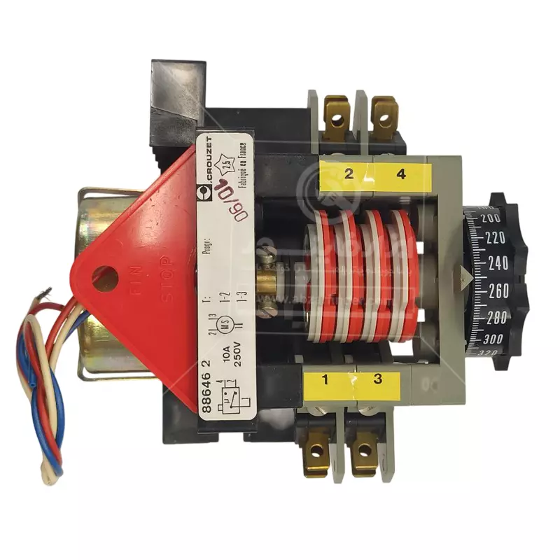 تایمر برنامهای مکانیکی Crouzet مدل 88646 یک تایمر مکانیکی صنعتی (Cam Timer) ساخت شرکت Crouzet فرانسه است. شرکت Crouzet از تولیدکنندگان قدیمی و معتبر تجهیزات کنترل، تایمر، موتور سنکرون و اتوماسیون صنعتی است و محصولات آن بهویژه در ماشینآلات اروپایی قدیمی و صنعتی بسیار رایج بودهاند. این تایمرها قبل از رواج تایمرهای دیجیتال، نقش اصلی را در کنترل زمانبندی عملیات صنعتی ایفا میکردند و هنوز هم بهدلیل سادهبودن، دوام بالا و عدم نیاز به الکترونیک پیچیده در برخی کاربردها استفاده میشوند. به زبان ساده این دستگاه برق را در زمانهای مشخص وصل و قطع میکند، آن هم بهصورت کاملاً مکانیکی. داخل دستگاه یک موتور سنکرون 50Hz وجود دارد، موتور با سرعت ثابت ۱ دور در دقیقه (1 RPM) میچرخد، این چرخش باعث حرکت دیسکهای بادامکی (قرمز رنگ) میشودبادامکها به نوبت کنتاکتهای الکتریکی را فشار میدهند و هر کنتاکت در زمان تعیینشده وصل یا قطع میشود، یعنی شما میتوانید تعیین کنید چه مداری، در چه زمانی، و برای چه مدت روشن یا خاموش شود. این تایمر بسیار بادوام، تعمیرپذیر و مقاوم در برابر نویز الکتریکی می باشد.
