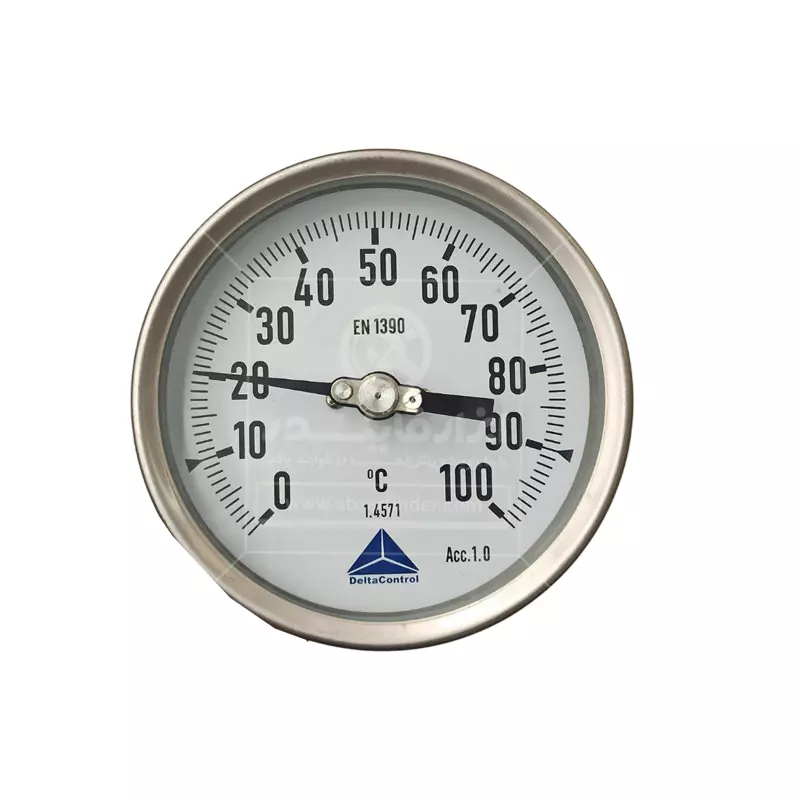 ترمومتر تاشو صفحه 10 سانت دلتا کنترل رنج 100 درجه سانتی گراد و طول 400 میلی متر یک دماسنج عقربهای صنعتی با ساقه فلزی قابل تنظیم است که برای اندازهگیری دمای سیالات (مایعات و گازها) در کاربردهای صنعتی، تأسیساتی و فرآیندی طراحی شده است. این مدلها برای اندازهگیری دمای سیالات صنعتی (مثل آب، بخار کمفشار، روغن، هوا/گازها و …) طراحی میشوند، جاهایی که برق و باتری نمیخواهید یا ندارید، ابزار باید ساده، مقاوم و همیشهکار باشد و یا خواندن دما از روی عقربه و صفحه کافی باشد. داخل دستگاه از فنر بیمتال مارپیچی استفاده شده است، با تغییر دما، بیمتال منبسط یا منقبض شده و باعث حرکت عقربه میشود، در واقع بدون نیاز به برق، دما را مستقیم و قابلاعتماد نشان میدهد. این مکانیزم بسیار بادوام است و نیاز به کالیبراسیون مداوم ندارد. این ترمومتر چون مکانیکی است، بهاندازهی سنسور دیجیتالِ کالیبرهشده “فوقدقیق” نیست، اما برای کنترلهای صنعتی عالی است. عبارت EN 1390 روی صفحه یعنی مطابق استاندارد اروپایی مربوط به ترمومترهای بیمتال/صفحهای می باشد.