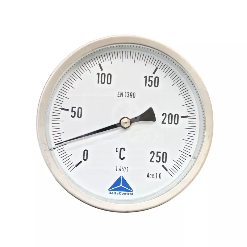 ترمومتر اتصال از پشت دلتا کنترل با طول سنسور 200 میلی متر یک ترمومتر عقربهای صنعتی با اتصال از پشت (Centre Back Stem) است، یعنی صفحهی گردِ نمایش از جلو دیده میشود، اما میله/سنسور از پشتِ بدنه وارد خط یا مخزن میشود. این مدلها برای اندازهگیری دمای سیالات صنعتی (مثل آب، بخار کمفشار، روغن، هوا/گازها و …) طراحی میشوند، جاهایی که برق و باتری نمیخواهید یا ندارید، ابزار باید ساده، مقاوم و همیشهکار باشد و یا خواندن دما از روی عقربه و صفحه کافی باشد. ویژگی کلیدی نسخهی «اتصال از پشت» این است که وقتی ترمومتر روی دیوار مخزن یا روی لوله از روبهرو نصب میشود، صفحه درست رو به اپراتور میایستد و میله از پشت وارد سیستم میشود. این ترمومتر معمولاً از نوع بیمتال (Bimetal) است. داخل بدنه یک قطعهی فلزی از دو فلز متفاوت وجود دارد که به هم چسبیدهاند، وقتی دما بالا/پایین میرود، هر فلز با نرخ متفاوتی منبسط/منقبض میشود، این اختلاف انبساط باعث پیچش یا حرکت مکانیکی آن قطعه میشود و در نهایت این حرکت با یک مکانیزم انتقال (چرخدنده/اهرم) به عقربه میرسد و عقربه روی صفحه عدد دما را نشان میدهد، در واقع بدون نیاز به برق، دما را مستقیم و قابلاعتماد نشان میدهد. این ترمومتر چون مکانیکی است، بهاندازهی سنسور دیجیتالِ کالیبرهشده “فوقدقیق” نیست، اما برای کنترلهای صنعتی عالی است. عبارت EN 1390 روی صفحه یعنی مطابق استاندارد اروپایی مربوط به ترمومترهای بیمتال/صفحهای می باشد.