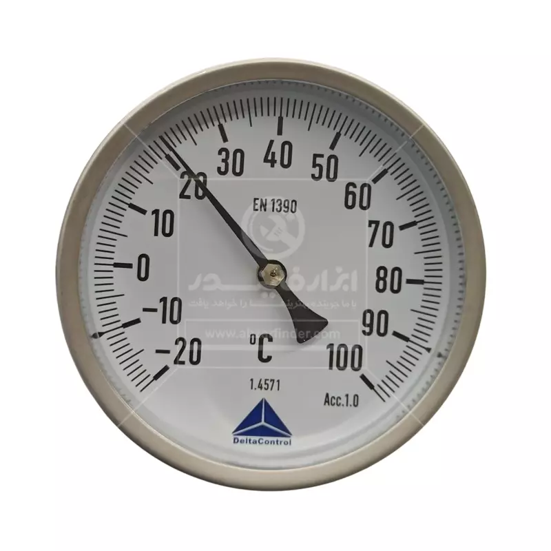ترمومتر اتصال از پشت دلتا کنترل با طول سنسور 300 میلی متر یک ترمومتر عقربهای صنعتی با اتصال از پشت (Centre Back Stem) است، یعنی صفحهی گردِ نمایش از جلو دیده میشود، اما میله/سنسور از پشتِ بدنه وارد خط یا مخزن میشود. این مدلها برای اندازهگیری دمای سیالات صنعتی (مثل آب، بخار کمفشار، روغن، هوا/گازها و …) طراحی میشوند، جاهایی که برق و باتری نمیخواهید یا ندارید، ابزار باید ساده، مقاوم و همیشهکار باشد و یا خواندن دما از روی عقربه و صفحه کافی باشد. ویژگی کلیدی نسخهی «اتصال از پشت» این است که وقتی ترمومتر روی دیوار مخزن یا روی لوله از روبهرو نصب میشود، صفحه درست رو به اپراتور میایستد و میله از پشت وارد سیستم میشود. این ترمومتر معمولاً از نوع بیمتال (Bimetal) است. داخل بدنه یک قطعهی فلزی از دو فلز متفاوت وجود دارد که به هم چسبیدهاند، وقتی دما بالا/پایین میرود، هر فلز با نرخ متفاوتی منبسط/منقبض میشود، این اختلاف انبساط باعث پیچش یا حرکت مکانیکی آن قطعه میشود و در نهایت این حرکت با یک مکانیزم انتقال (چرخدنده/اهرم) به عقربه میرسد و عقربه روی صفحه عدد دما را نشان میدهد، در واقع بدون نیاز به برق، دما را مستقیم و قابلاعتماد نشان میدهد. این ترمومتر چون مکانیکی است، بهاندازهی سنسور دیجیتالِ کالیبرهشده “فوقدقیق” نیست، اما برای کنترلهای صنعتی عالی است. عبارت EN 1390 روی صفحه یعنی مطابق استاندارد اروپایی مربوط به ترمومترهای بیمتال/صفحهای می باشد.