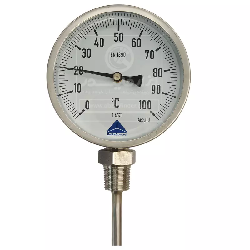 ترمومتر صفحه 10 سانت دلتا کنترل رنج 100 درجه سانتیگراد و طول 300 میلی متر یک ترمومتر عقربهای صنعتی با اتصال از پشت (Centre Back Stem) است، یعنی صفحهی گردِ نمایش از جلو دیده میشود، اما میله/سنسور از پشتِ بدنه وارد خط یا مخزن میشود. این مدلها برای اندازهگیری دمای سیالات صنعتی (مثل آب، بخار کمفشار، روغن، هوا/گازها و …) طراحی میشوند، جاهایی که برق و باتری نمیخواهید یا ندارید، ابزار باید ساده، مقاوم و همیشهکار باشد و یا خواندن دما از روی عقربه و صفحه کافی باشد. ویژگی کلیدی نسخهی «اتصال از پشت» این است که وقتی ترمومتر روی دیوار مخزن یا روی لوله از روبهرو نصب میشود، صفحه درست رو به اپراتور میایستد و میله از پشت وارد سیستم میشود. این ترمومتر معمولاً از نوع بیمتال (Bimetal) است. داخل بدنه یک قطعهی فلزی از دو فلز متفاوت وجود دارد که به هم چسبیدهاند، وقتی دما بالا/پایین میرود، هر فلز با نرخ متفاوتی منبسط/منقبض میشود، این اختلاف انبساط باعث پیچش یا حرکت مکانیکی آن قطعه میشود و در نهایت این حرکت با یک مکانیزم انتقال (چرخدنده/اهرم) به عقربه میرسد و عقربه روی صفحه عدد دما را نشان میدهد، در واقع بدون نیاز به برق، دما را مستقیم و قابلاعتماد نشان میدهد. این ترمومتر چون مکانیکی است، بهاندازهی سنسور دیجیتالِ کالیبرهشده “فوقدقیق” نیست، اما برای کنترلهای صنعتی عالی است. عبارت EN 1390 روی صفحه یعنی مطابق استاندارد اروپایی مربوط به ترمومترهای بیمتال/صفحهای می باشد.