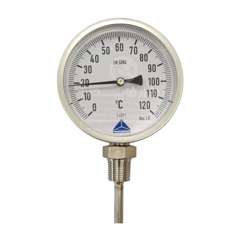 ترمومتر صفحه 10 سانت دلتا کنترل رنج 120 درجه سانتیگراد و طول 300 میلی متر میلی متر یک ترمومتر عقربهای صنعتی با اتصال از پشت (Centre Back Stem) است، یعنی صفحهی گردِ نمایش از جلو دیده میشود، اما میله/سنسور از پشتِ بدنه وارد خط یا مخزن میشود. این مدلها برای اندازهگیری دمای سیالات صنعتی (مثل آب، بخار کمفشار، روغن، هوا/گازها و …) طراحی میشوند، جاهایی که برق و باتری نمیخواهید یا ندارید، ابزار باید ساده، مقاوم و همیشهکار باشد و یا خواندن دما از روی عقربه و صفحه کافی باشد. ویژگی کلیدی نسخهی «اتصال از پشت» این است که وقتی ترمومتر روی دیوار مخزن یا روی لوله از روبهرو نصب میشود، صفحه درست رو به اپراتور میایستد و میله از پشت وارد سیستم میشود. این ترمومتر معمولاً از نوع بیمتال (Bimetal) است. داخل بدنه یک قطعهی فلزی از دو فلز متفاوت وجود دارد که به هم چسبیدهاند، وقتی دما بالا/پایین میرود، هر فلز با نرخ متفاوتی منبسط/منقبض میشود، این اختلاف انبساط باعث پیچش یا حرکت مکانیکی آن قطعه میشود و در نهایت این حرکت با یک مکانیزم انتقال (چرخدنده/اهرم) به عقربه میرسد و عقربه روی صفحه عدد دما را نشان میدهد، در واقع بدون نیاز به برق، دما را مستقیم و قابلاعتماد نشان میدهد. این ترمومتر چون مکانیکی است، بهاندازهی سنسور دیجیتالِ کالیبرهشده “فوقدقیق” نیست، اما برای کنترلهای صنعتی عالی است. عبارت EN 1390 روی صفحه یعنی مطابق استاندارد اروپایی مربوط به ترمومترهای بیمتال/صفحهای می باشد.