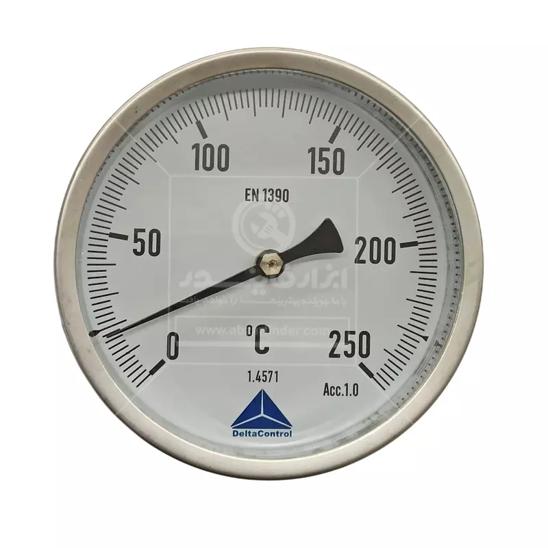 ترمومتر اتصال از پشت دلتا کنترل رنج 0 تا 250 درجه سانتیگراد یک ترمومتر عقربهای صنعتی با اتصال از پشت (Centre Back Stem) است، یعنی صفحهی گردِ نمایش از جلو دیده میشود، اما میله/سنسور از پشتِ بدنه وارد خط یا مخزن میشود. این مدلها برای اندازهگیری دمای سیالات صنعتی (مثل آب، بخار کمفشار، روغن، هوا/گازها و …) طراحی میشوند، جاهایی که برق و باتری نمیخواهید یا ندارید، ابزار باید ساده، مقاوم و همیشهکار باشد و یا خواندن دما از روی عقربه و صفحه کافی باشد. ویژگی کلیدی نسخهی «اتصال از پشت» این است که وقتی ترمومتر روی دیوار مخزن یا روی لوله از روبهرو نصب میشود، صفحه درست رو به اپراتور میایستد و میله از پشت وارد سیستم میشود. این ترمومتر معمولاً از نوع بیمتال (Bimetal) است. داخل بدنه یک قطعهی فلزی از دو فلز متفاوت وجود دارد که به هم چسبیدهاند، وقتی دما بالا/پایین میرود، هر فلز با نرخ متفاوتی منبسط/منقبض میشود، این اختلاف انبساط باعث پیچش یا حرکت مکانیکی آن قطعه میشود و در نهایت این حرکت با یک مکانیزم انتقال (چرخدنده/اهرم) به عقربه میرسد و عقربه روی صفحه عدد دما را نشان میدهد، در واقع بدون نیاز به برق، دما را مستقیم و قابلاعتماد نشان میدهد. این ترمومتر چون مکانیکی است، بهاندازهی سنسور دیجیتالِ کالیبرهشده “فوقدقیق” نیست، اما برای کنترلهای صنعتی عالی است. عبارت EN 1390 روی صفحه یعنی مطابق استاندارد اروپایی مربوط به ترمومترهای بیمتال/صفحهای می باشد.