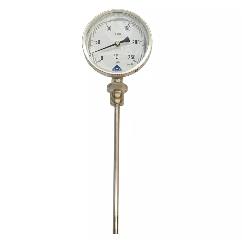 ترمومتر صفحه 10 سانت دلتا کنترل رنج 250 درجه سانتیگراد و طول 200 میلی متر برای اندازهگیری دمای سیالات صنعتی (مثل آب، بخار کمفشار، روغن، هوا/گازها و …) طراحی میشوند و معمولاً در صنایع تأسیسات، نفت و گاز، آب و بخار، و فرآیندهای صنعتی استفاده میشود.