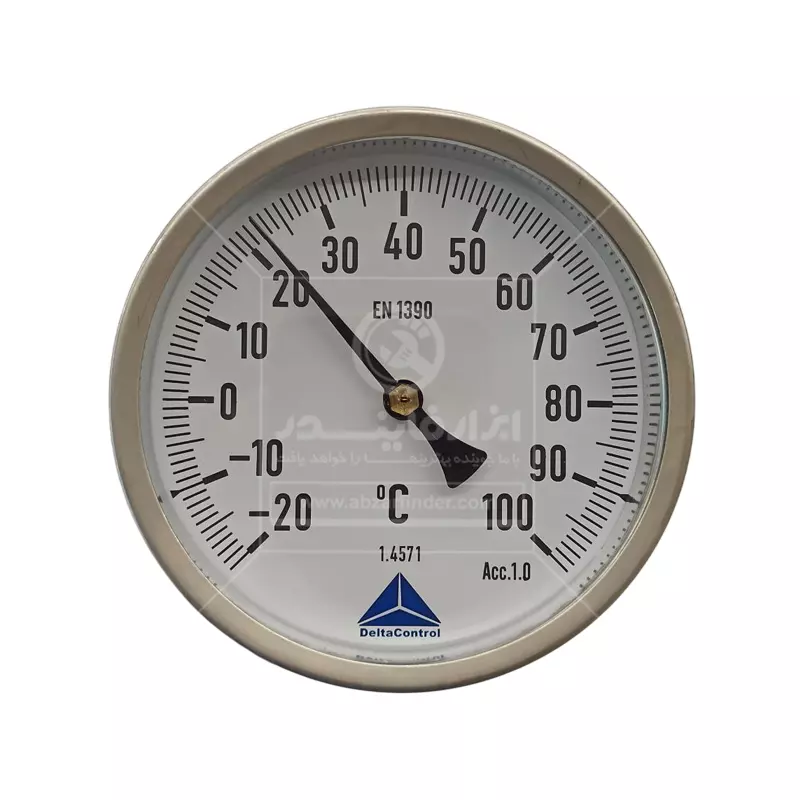 ترمومتر اتصال از پشت دلتا کنترل رنج 20- تا 100 درجه سانتیگراد یک ترمومتر عقربهای صنعتی با اتصال از پشت (Centre Back Stem) است، یعنی صفحهی گردِ نمایش از جلو دیده میشود، اما میله/سنسور از پشتِ بدنه وارد خط یا مخزن میشود. این مدلها برای اندازهگیری دمای سیالات صنعتی (مثل آب، بخار کمفشار، روغن، هوا/گازها و …) طراحی میشوند، جاهایی که برق و باتری نمیخواهید یا ندارید، ابزار باید ساده، مقاوم و همیشهکار باشد و یا خواندن دما از روی عقربه و صفحه کافی باشد. ویژگی کلیدی نسخهی «اتصال از پشت» این است که وقتی ترمومتر روی دیوار مخزن یا روی لوله از روبهرو نصب میشود، صفحه درست رو به اپراتور میایستد و میله از پشت وارد سیستم میشود. این ترمومتر معمولاً از نوع بیمتال (Bimetal) است. داخل بدنه یک قطعهی فلزی از دو فلز متفاوت وجود دارد که به هم چسبیدهاند، وقتی دما بالا/پایین میرود، هر فلز با نرخ متفاوتی منبسط/منقبض میشود، این اختلاف انبساط باعث پیچش یا حرکت مکانیکی آن قطعه میشود و در نهایت این حرکت با یک مکانیزم انتقال (چرخدنده/اهرم) به عقربه میرسد و عقربه روی صفحه عدد دما را نشان میدهد، در واقع بدون نیاز به برق، دما را مستقیم و قابلاعتماد نشان میدهد. این ترمومتر چون مکانیکی است، بهاندازهی سنسور دیجیتالِ کالیبرهشده “فوقدقیق” نیست، اما برای کنترلهای صنعتی عالی است. عبارت EN 1390 روی صفحه یعنی مطابق استاندارد اروپایی مربوط به ترمومترهای بیمتال/صفحهای می باشد.