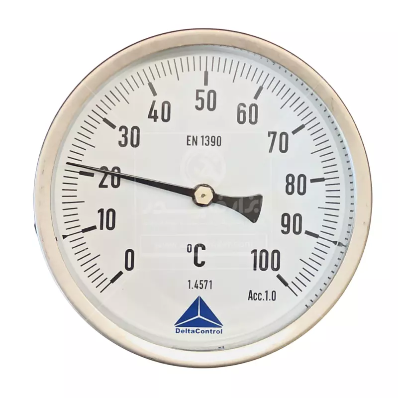 ترمومتر اتصال از پشت دلتا کنترل با طول سنسور ۴۰۰ میلی متر یک ترمومتر عقربهای صنعتی با اتصال از پشت (Centre Back Stem) است، یعنی صفحهی گردِ نمایش از جلو دیده میشود، اما میله/سنسور از پشتِ بدنه وارد خط یا مخزن میشود. این مدلها برای اندازهگیری دمای سیالات صنعتی (مثل آب، بخار کمفشار، روغن، هوا/گازها و …) طراحی میشوند، جاهایی که برق و باتری نمیخواهید یا ندارید، ابزار باید ساده، مقاوم و همیشهکار باشد و یا خواندن دما از روی عقربه و صفحه کافی باشد. ویژگی کلیدی نسخهی «اتصال از پشت» این است که وقتی ترمومتر روی دیوار مخزن یا روی لوله از روبهرو نصب میشود، صفحه درست رو به اپراتور میایستد و میله از پشت وارد سیستم میشود. این ترمومتر معمولاً از نوع بیمتال (Bimetal) است. داخل بدنه یک قطعهی فلزی از دو فلز متفاوت وجود دارد که به هم چسبیدهاند، وقتی دما بالا/پایین میرود، هر فلز با نرخ متفاوتی منبسط/منقبض میشود، این اختلاف انبساط باعث پیچش یا حرکت مکانیکی آن قطعه میشود و در نهایت این حرکت با یک مکانیزم انتقال (چرخدنده/اهرم) به عقربه میرسد و عقربه روی صفحه عدد دما را نشان میدهد، در واقع بدون نیاز به برق، دما را مستقیم و قابلاعتماد نشان میدهد. این ترمومتر چون مکانیکی است، بهاندازهی سنسور دیجیتالِ کالیبرهشده “فوقدقیق” نیست، اما برای کنترلهای صنعتی عالی است. عبارت EN 1390 روی صفحه یعنی مطابق استاندارد اروپایی مربوط به ترمومترهای بیمتال/صفحهای می باشد.