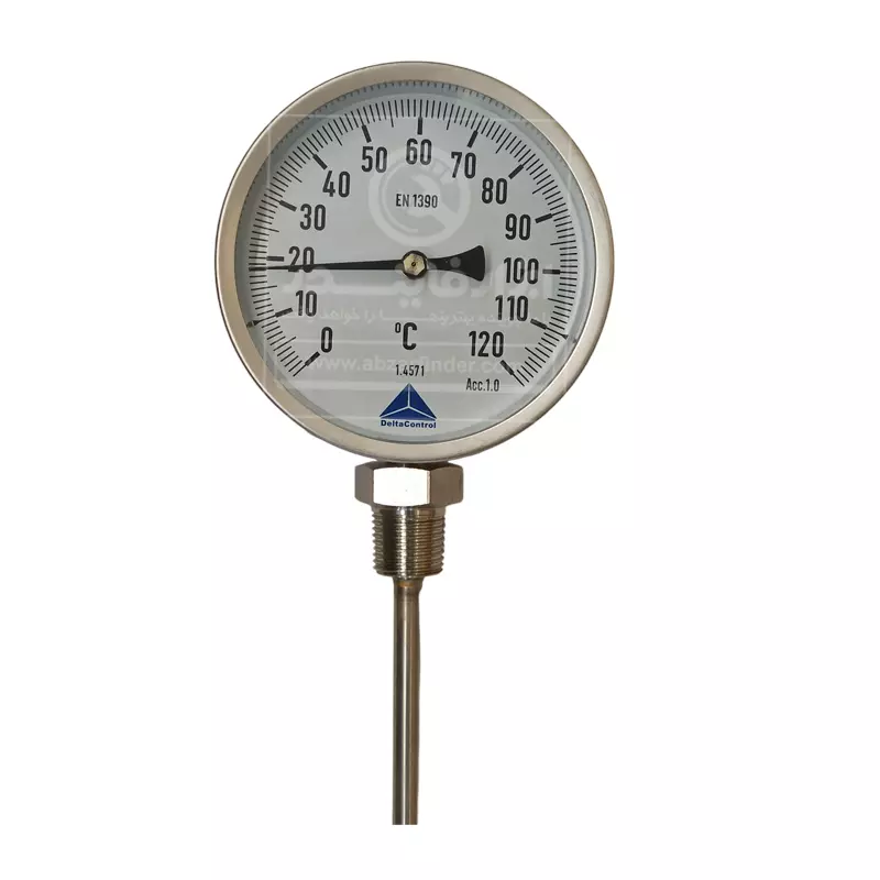 ترمومتر صفحه 10 سانت دلتا کنترل رنج 120 درجه سانتیگراد و طول 400 میلی متر یک ترمومتر عقربهای صنعتی با اتصال از زیر است. این مدلها برای اندازهگیری دمای سیالات صنعتی (مثل آب، بخار کمفشار، روغن، هوا/گازها و …) طراحی میشوند، جاهایی که برق و باتری نمیخواهید یا ندارید، ابزار باید ساده، مقاوم و همیشهکار باشد و یا خواندن دما از روی عقربه و صفحه کافی باشد. این ترمومتر معمولاً از نوع بیمتال (Bimetal) است. داخل بدنه یک قطعهی فلزی از دو فلز متفاوت وجود دارد که به هم چسبیدهاند، وقتی دما بالا/پایین میرود، هر فلز با نرخ متفاوتی منبسط/منقبض میشود، این اختلاف انبساط باعث پیچش یا حرکت مکانیکی آن قطعه میشود و در نهایت این حرکت با یک مکانیزم انتقال (چرخدنده/اهرم) به عقربه میرسد و عقربه روی صفحه عدد دما را نشان میدهد، در واقع بدون نیاز به برق، دما را مستقیم و قابلاعتماد نشان میدهد. این ترمومتر چون مکانیکی است، بهاندازهی سنسور دیجیتالِ کالیبرهشده “فوقدقیق” نیست، اما برای کنترلهای صنعتی عالی است. عبارت EN 1390 روی صفحه یعنی مطابق استاندارد اروپایی مربوط به ترمومترهای بیمتال/صفحهای می باشد.