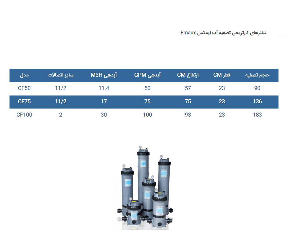 فیلتر کارتریجی استخر ایمکس Emaux مدل CF75 ،(Emaux CF75 Cartridge Filter) آب را شفاف و زلال می کند و معمولا کاربرد آن در استخرهای درمانی می باشد و البته فیلترهای کارتریجی استخر هزینه جاری و هزینه اولیه بالایی دارند.