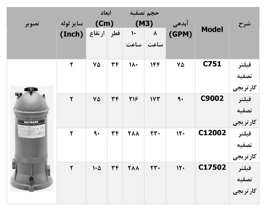 فیلتر کارتریجی استخر هایوارد مدل C751 ،(Hayward C751 Cartridge Filter)  آب را شفاف و زلال می کند و معمولا کاربرد آن در استخرهای درمانی می باشد و البته فیلترهای کارتریجی استخر هزینه جاری و هزینه اولیه بالایی دارند اما بدلیل مدرن بودن تکنولوژی ساخت و عملکرد آنها، بازده و راندمان بالاتری نسبت به فیلترهای شنی و دیاتومه دارند