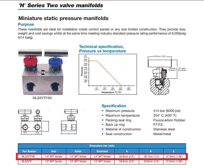 مشخصات فنی منیفولد 2 شیر پارکر مدل MLS2VTF4N