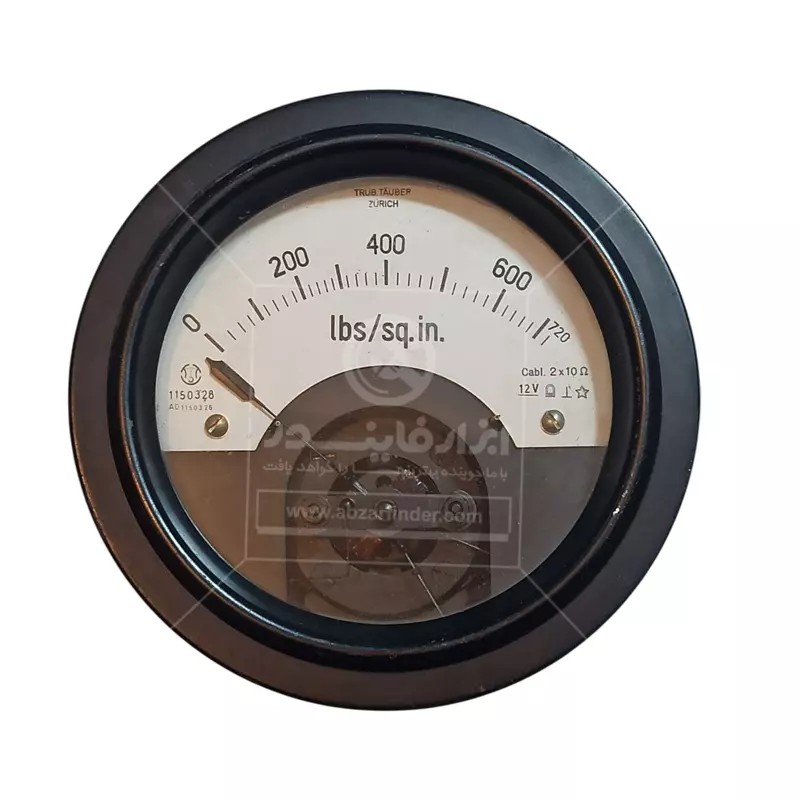 فشارسنج الکتریکی برند TRÜB TÄUBER در اصل یک نشان‌دهندهٔ فشار الکتریکی ساخت شرکت سوئیسی است که فشار را به واحد lbs/sq.in = psi نمایش می‌دهد و برای کار در سیستم‌های ۱۲ ولت DC طراحی شده است. این شرکت تنها تولیدکنندهٔ بعضی مدل‌های ابزار الکترومکانیکی اندازه‌گیری بوده و در آن زمان نقش مهمی در صنعت اندازه‌گیری  داشته است. این گیج مستقیماً به فشارِ سیال وصل نمی‌شود (هیچ ورودی مکانیکی/لوله‌ای روی خودش ندار‌د) بلکه یک نشان‌دهندهٔ الکتریکی است که سیگنال را از یک سنسور فشارِ دور از دستگاه می‌گیرد. عبارت «2×10 Ω» به مقاومت مدار/کابل یا کویل‌های داخلی اشاره دارد و از نظر طراحی برای مدار ۱۲ ولت تنظیم شده است. این گیج ها معمولا در تابلوهای کنترل صنعتی یا دریایی، سیستم‌های هیدرولیک و خودروها یا هواپیماها با شبکهٔ ۱۲ ولت DC که نیاز به خواندن فشار روغن یا هیدرولیک روی داشبورد یا پنل دارند کاربرد دارد. خودِ این دستگاه فقط نمایشگر است، برای کارکرد کامل به یک سنسور فشار نیاز دارد که معمولاً یا از نوع استرین‌گیج / پل ویتستون است و یا از نوع مبدل مقاومتی/سیمی که با فشار، مقاومتش تغییر می‌کند. سنسور در نقطه‌ای که فشار واقعی وجود دارد نصب می‌شود (مثلاً روی لولهٔ هیدرولیک) و خروجی الکتریکی‌اش از طریق کابل ۲ سیمه به این نشان‌دهنده می‌رسد. صفحهٔ مدرج به psi کالیبره شده تا برای جریان معینی، عدد متناظر با فشار نمایش داده شود. به‌خاطر این‌که مکانیزم الکترو-مکانیکی است، پاسخ دستگاه نسبتاً نرم و پیوسته و برای نشان دادن فشار لحظه‌ای بسیار مناسب است.