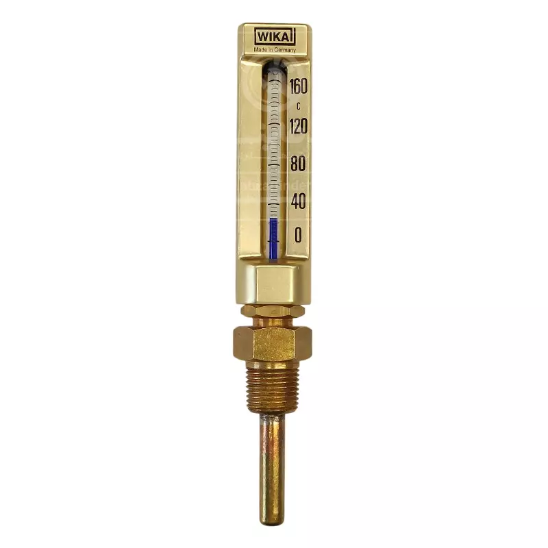 ترمومتر الکلی 0 تا 160 درجه ویکا مدل TM32-L6CM در حقیقت همان نوع جیوه ایست که این بار الکل به جای جیوه قرار گرفته است و در مقابل نوع جیوه ای، به خاطر استفاده از الکل خطر کمتری دارد. در واقع این قطعه یک ترمومتر صنعتی مایعدرونشیشه (liquid-in-glass) یا ترمومتر غوطهرو با بدنه برنجی است که توسط برند آلمانی WIKA عرضه میشود. محدودهٔ نشاندادۀ آن در عکس از 0 تا 160 درجهٔ سانتیگراد است و ستون مایع رنگی (آبی) تغییر ارتفاع میدهد تا دمای محیط یا سیال را نشان دهد. طراحی و اتصال رزوهای پایینی نشان میدهد برای نصب در فرآیند (مثلاً درون محفظه، روی خط لوله یا روی بدنهٔ مخزن/دستگاه) در نظر گرفته شده است. ترمومترهای سادهٔ مایعدرونشیشه معمولاً پایدارند، اما برای کاربردهای حساس بهتر است بهصورت دورهای با استاندارد (حمام آب دمای کنترلشده یا مقایسه با ترمومتر مرجع) بررسی شوند و در صورت شکستگی لولهٔ شیشهای یا ناپایداری ستون مایع، ترمومتر باید تعویض شود.